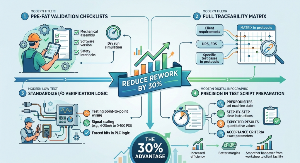 Reducing rework by 30% is not about working faster; it is about working smarter through documentation. By utilizing pre-FAT validation checklists, maintaining a rigorous traceability matrix, verifying I/O verification logic early, and putting effort into test script preparation, you create a “right-the-first-time” culture.
